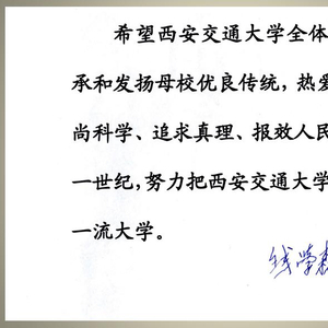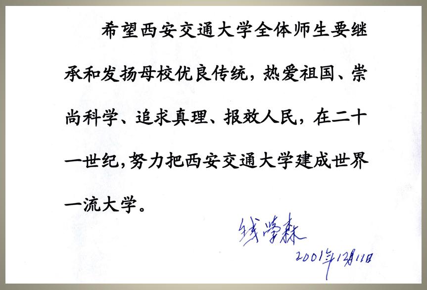 君子言传身教,立德于行。“热爱祖国,崇尚科学,追求真理,报效人民”是钱学森学长用自己毕生的实践与德行,为交大人作出了表率。我们交大人有能力有志气前赴后继,世代以钱学森学长为榜样,永远弘扬钱学森精神,一定能在二十一世纪前期,尽快“把西安交通大学建成世界一流大学”!