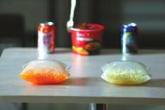 实验过程:将一桶泡好的方便面挑出,分成两半分别装入密封塑料袋中,然后分别将冰峰和雪碧打开,先往两个袋子分别倒入半罐饮料(面未被完全淹没),然后密封。