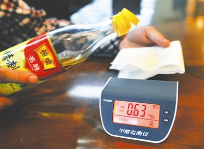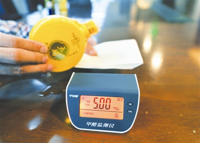 结果发现,当面包、白酒、香水、爽肤水靠近监测仪时,甲醛数值会迅速飙升,发出红色警报。屏幕显示,甲醛浓度达到5毫克/立方米,超过国家标准61.5倍。料酒的测试数值是0.63毫克/立方米,但也超标近7倍。只要监测仪远离这些物质,甲醛数值就会逐渐回到正常水平。