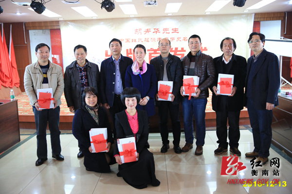 衡南县领导邓中文、周秋生、夏海蓉、陈朝晖等出席首发仪式。受作者委托,出席仪式的衡南县领导向县文联、县档案馆、县图书馆、县文化馆、县志办、县文物局等基层宣传文化单位转赠了《中国姓氏起源考与历史名人》图书。
