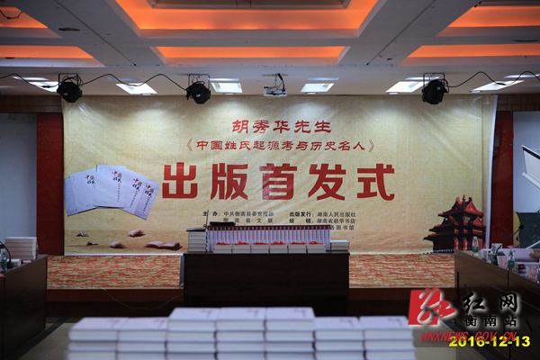 红网衡南县分站12月14日讯(分站记者 陆元连 康廉泽 摄影 陆昕)姓氏是人类文明的曙光,是中华民族的根基。近日,由湖南省衡南县籍退休干部胡秀华先生编撰的《中国姓氏起源考与历史名人》一书在湖南人民出版社出版,该书遴选500个姓氏与1500余位历史代表人物,是一部追溯中国姓氏的起源的资料性著述。12月13日,新书首发仪式在湖南省衡南县城云集镇举行,衡南县委常委、宣传部长黄科卫出席首发式。他表示,该书有着深远的史料价值和现实意义,它的出版发行对姓氏学界、文化界和广大读者而言,都是喜讯。