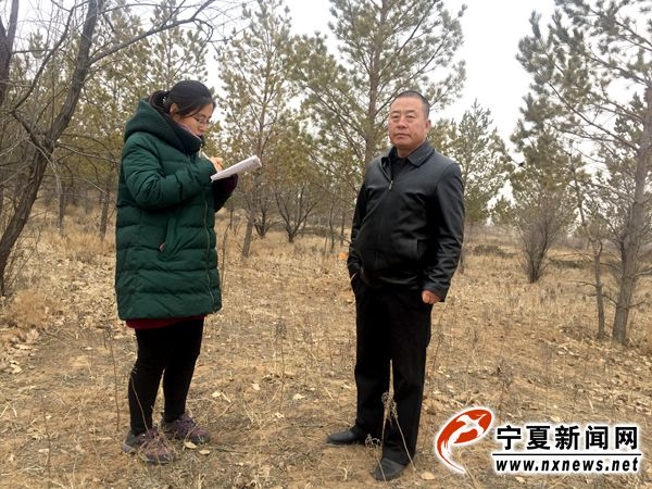 盐池县环林局林业技术推广中心负责人孙果向记者介绍盐池县生态治理情况。