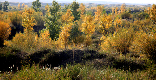沿着明长城遗址,从高沙窝镇兴武村到二步坑村,再到花马池镇长城村,道路两旁布满了透着墨绿色的植被。满坡一丛丛一簇簇的沙蒿在风中摇曳,二步坑村3米宽的柠条与6米宽的苜蓿宛如一条绿毯铺在地上。走在长城村的万亩林场,脚下厚厚的树叶发出“沙沙”的响声。“盐池县二百万亩的沙地全部得到了治理,一百亩以上的明沙丘基本找不到了,植被覆盖度达到了70%,林木覆盖度达到了31%。”盐池县环境保护和林业局副局长王增吉手扶着碗口粗的树杆向记者介绍着。