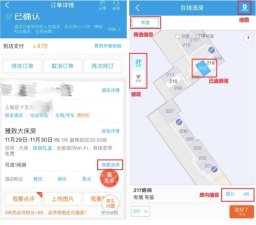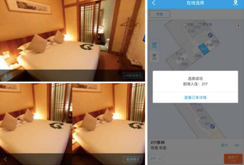 通过VR选房服务,用户在预定酒店时,入住日当天10点后,在订单页面可以点选“我要选房”,通过互动信息从不同维度筛选房间。除了基本的楼层、房型、房价乃至房号等信息以外,通过VR手段,用户能身临其境般感知房间内的720度全景甚至室外风景,犹如身在房间之中。此外,通过引入数字化室内地图,更方便用户掌握房间位置信息。