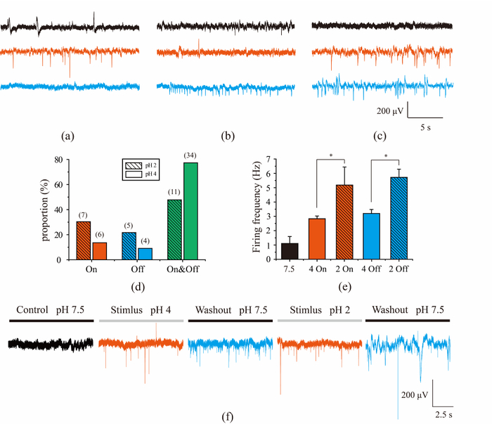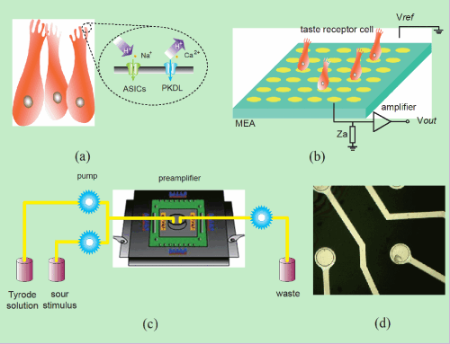 为了进一步了解味觉的工作机制,近期,中国科学院苏州生物医学工程技术研究所周连群课题组博士张威等与中科院生物物理研究所、浙江大学共同研究,以酸敏感味觉传感为例进行了研究。实验方法是建立包含ASIC和PKDL两种酸敏感通道的全细胞模型,并利用膜片钳记录的胞内电位仿真细胞在不同pH的盐酸刺激下的响应。经研究,ASIC主要在酸刺激施加时产生内向电流并发放兴奋电位(on-response);而PKDL通道在酸刺激施加时受到抑制,当酸刺激撤去pH回升才发放电位(off-response)。因此,工作人员利用微电极阵列传感器(microelectrode array,MEA)构建了味觉受体细胞传感器,采用无损的胞外记录方式,实现了对酸敏感味觉受体细胞ASIC和PKDL酸敏感通道的实时检测,并与味觉模型仿真结果一致。实验着重分析了酸敏感细胞对pH2和pH4不同酸刺激施加和洗脱之后的响应,成功建立基于味觉细胞的生物传感器。该实验对酸敏感味觉的工作机制进行了深入研究,有助于进一步解释味觉受体细胞酸味传感机制和电位编码方式,揭开味觉信息传导的冰山一角。