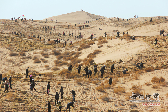 武威市机关干部在金荣沙漠生态公路义务压沙造林基地压沙。(资料图)