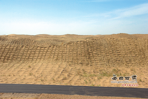 甘肃内蒙古省(区)界武威段千里沙漠大林带治沙路一侧的沙障。(资料图)