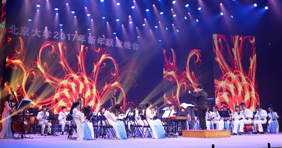 晚会现场22时整,晚会在激情昂扬、催人奋进的开场视频和民乐合奏《奔腾》中拉开帷幕。视频生动而全面地回顾了北京大学2016年在党建工作、教学科研、学生培养、国际交流、校园建设、校园文化等方面取得的成绩,表达了北大人不忘初心、继往开来,走好新长征路的昂扬斗志。