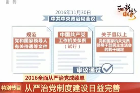 2016 年6月28日,中共中央政治局召开会议,审议通过《中国共产党问责条例》;2016年10月24日至27日,十八届六中全会审议通过了《关于新形势下党内 政治生活的若干准则》和《中国共产党党内监督条例》;2016年11月30日,中共中央政治局召开会议,审议通过了规范党和国家领导人有关待遇等文件、 《中国共产党工作机关条例(试行)》以及《关于县以上党和国家机关党员领导干部民主生活会的若干规定》。