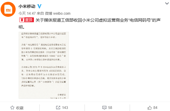 1月4日消息,小米移动官方通过微博发表了关于媒体报道工信部收回小米公司虚拟运营商业务“电信网码号”的声明。声明表示,此次工信部收回的是小米为开展虚拟运营商(行业内称“移动通信转售”)业务预申请的客服号10046“码号”资源,此举系小米移动主动申请退回的结果。