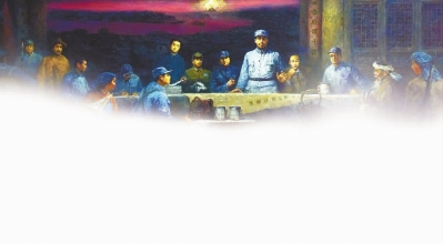 《保卫湘潭》大型油画,长达3米、高约1米。画中,周恩来位于画面中心,湘潭各界人士围坐一桌。远处天色透着紫红,可以看到长沙方向燃起的大火。作品标签上写着:1938年周恩来、叶剑英、郭沫若、田汉、杨第甫在霞城书院召开重要军事会议部署抗日,使湘潭免于又一场“文夕大火”。