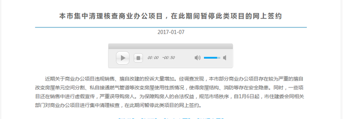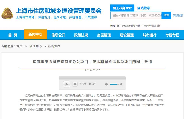 1月7日,上海住建委于官网发布消息称,为保障购房人的合法权益,规范市场秩序,自1月6日起,市住建委会同相关部门对商业办公项目进行集中清理核查,在此期间暂停此类项目的网上签约。