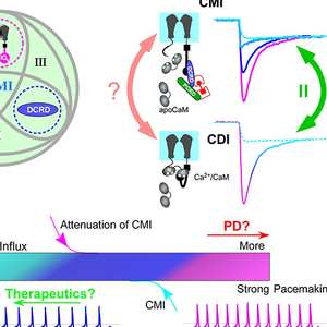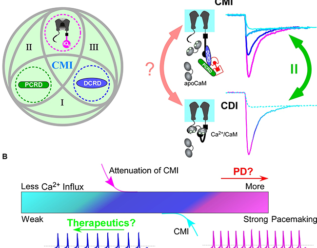 A图为碳末端介导抑制(CMI)三元素间的协同组合法则(左)。在其中任何两元素空间距离足够接近的情况下,第三个元素作为调控多肽通过碳末端介导抑制(CMI)方式抑制L型钙通道。通过瞬时性施加小分子(雷帕霉素)连接两个多肽(PCRD和DCRD)后,高峰值、强钙依赖性失活(CDI)的钙电流(右图中粉色)峰值大幅降低(削减约65%)同时钙依赖性失活基本消除(青色)。首次揭示了碳末端介导抑制(CMI)的重要特征:无论碳末端介导抑制(CMI)效力(potency)如何,终态钙依赖性失活的电流幅值维持不变,确保碳末端介导抑制(CMI)能够削减钙内流并定量决定了其极限效力(maximum potency),同时提示碳末端介导抑制(CMI)机制可能与钙依赖性失活等经典过程类似地参与通道的核心门控。B图SNc(黑质纹状体)神经元模型中,钙依赖性失活能够削弱CaV1.3钙电流和自发节律性振荡,进而缓解帕金森症(PD)中的钙超载(粉色),提示可利用钙依赖性失活开发新型的疾病干预手段。