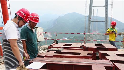“北盘江特大桥是毕都高速公路的节点工程,由于征地等原因,云南岸工期晚了约8个月,我们面临着非常大的工期压力,如果按照传统的‘杆件或桁片’进行安装,工期将会大大延长。”廖万辉说,技术和工程团队想尽办法把延误的工期用追赶上来。“为了赶上工期进度,我们对北盘江特大桥中跨的施工工艺进行了深入的研究,提出了中跨纵移悬拼施工方法。”这项新工艺优化了节段空中拼接作业流程,减少高空施工作业,降低安全风险,节约了3个月的工期,也大大的降低了建设成本。“纵移悬拼的创新点主要是整节段梁底轨道运输安装,采用地面拼装成整体节段后进行整体吊装。”廖万辉团队为保证纵移悬拼施工方法的可靠性,多次试验研究论证,研制了纵移悬拼施工成套架设设备。