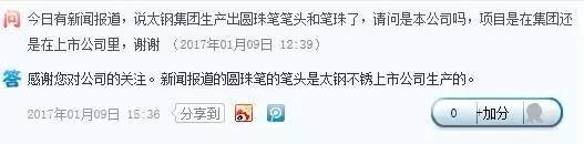 每日经济新闻(微信号:nbdnews)记者注意到,在报道传出后,1月9日就有投资者在互动平台上问询太钢不锈上述新闻相关事宜,称:“近日有新闻报道,说太钢集团生产出圆珠笔笔头和笔珠了,请问是本公司吗,项目是在集团还是在上市公司里?”