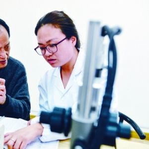 在南京理工大学,王泽山院士(左)指导在读博士季丹丹进行三维视频显微镜实验(2016年10月21日摄)。新华社