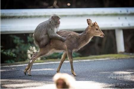 [环球网报道 记者 马丽]据日本媒体报道,日本屋久岛一只公弥猴试图骑上母鹿背上进行交配,这异种交配行为被法国动物学家观察拍摄到,这是科学家第二次在自然界观察到异种交配案例,相关论文刊登在十日出版的《灵长类》(Primates)期刊。