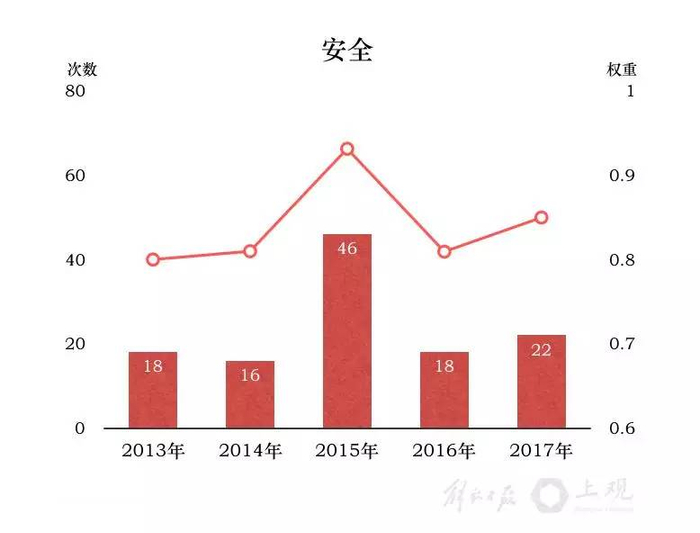 城市运行安全已被列为上海的四条底线之一,而“安全”一词的数量在2015年报告中出现陡增,多少与发生不久的外滩拥挤踩踏事件有关。当年的政府工作报告专门列出一大段反思外滩拥挤踩踏事件带来的教训,并强调城市安全的极端重要性。此后,“守牢城市安全底线”的话语每年均会出现,并提出要从严从细落实安全责任、健全一系列相关机制,严防安全事故。