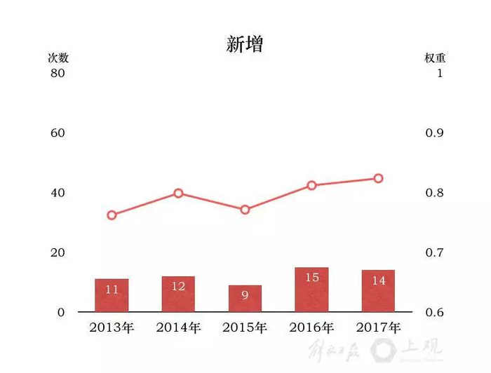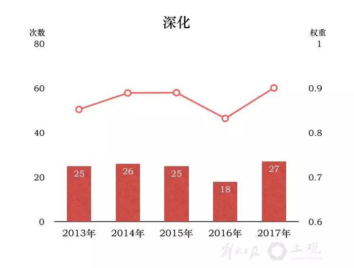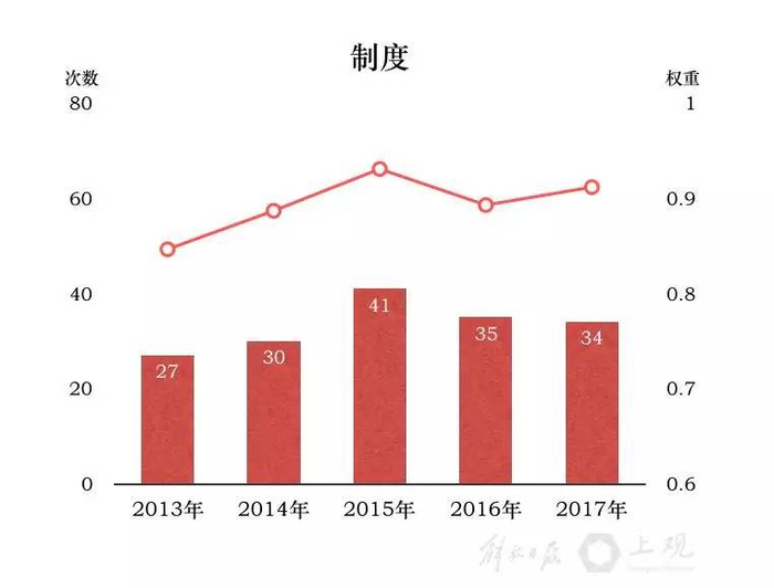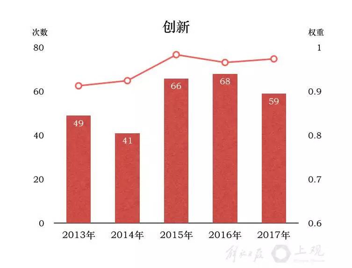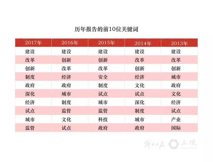 其中大多数词,也是2013年至2017年五年《政府工作报告》中总计出现频次最高的词。而在历年的“前十”排行榜中,“建设”、“改革”、“创新”、“政府”、“试点”每年在列。