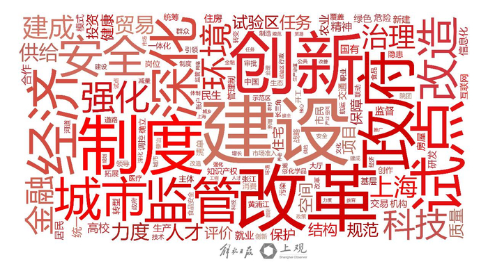 在各地的政府工作报告中,“建设”都是出现率最高的通用词,涵盖各方面。而后面这些高频词的变动,则颇有近年上海特色。