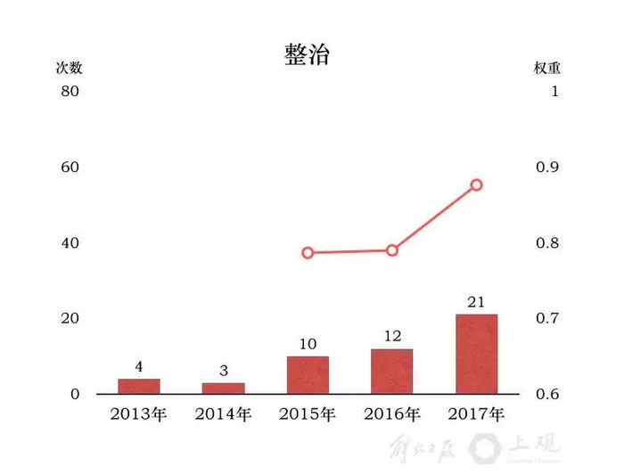 另一个出现率“陡增”的词是“整治”。围绕守底线、补短板,加强社会治理和环境治理,“整治”一词出现的频率持续上升。一年来,上海开展了交通违法行为大整治、城市安全隐患整治、农村环境整治,全力推进“五违四必”区域环境综合整治,区域环境显著改善。这些努力,体现出上海城市综合管理和精细化管理水平在提高。今年,上海还将继续整治城市管理顽症,健全整治的长效机制。