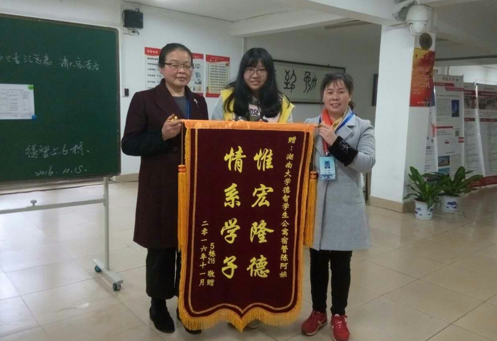 外国语学院5栋216的两位大一同学,不懂怎么把内务搞好。陈霞辉知道后,到她们寝室去手把手教,怎么摆放洗漱用品,怎么摆放被子,书桌如何正确摆放等等全都细细地教了一遍。两位学生给她送去了写着“惟宏隆德,情系学子”的锦旗。“学生们就像自己的孩子,只要你对她们好,她们就会对你好,只要付出真心,就会有回报。”在陈霞辉心里,这些来自天南地北的孩子,是支持她工作的源源不断的动力。