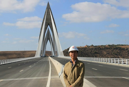 2016年5月28日,中铁大桥局青年桥梁工程师陈海波在建设了3年的摩洛哥穆罕默德六世大桥上留念,这是非洲最大的斜拉桥。