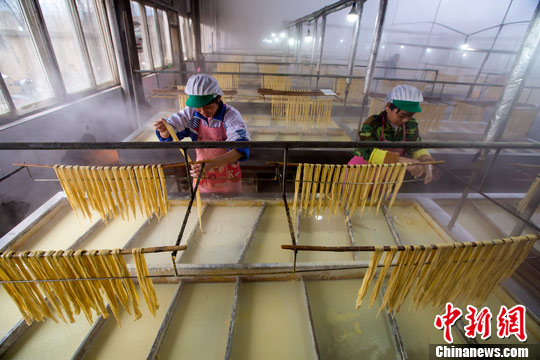 腐竹要历经选豆、去皮、泡豆、磨浆、甩浆、煮浆、滤浆、提取腐竹、烘干、包装等十道工序才能制成。杨风胜 摄