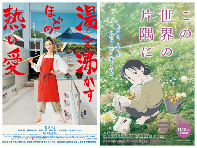 电影节放映两部日本《电影旬报》年度十佳之作,《滚烫的爱》(左)和《在这世界的角落》(右)