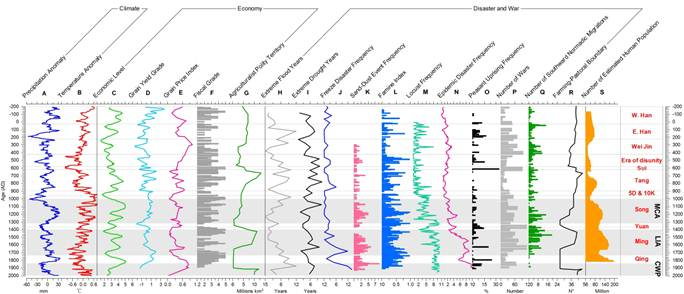图 2 降水和温度解释的17个历史文献记录中的变量。EL(economic level经济水平), GY(grain yield grade谷物产量), GPI(grain price index米价指数), FG(fiscal grade税收等级), AT(agriculturalist policy territory农业国家领土面积), EF(extreme flood years洪灾指数), ED(extreme drought years旱灾指数), FD(freeze disaster frequency冻灾指数), SD(sand-dust event frequency沙尘暴指数), FI(famine index饥荒指数), LF(locust frequency蝗灾指数), EPD(epidemic disaster frequency瘟疫指数), PUF(peasant uprising frequency农民起义频率), NW(number of wars战争数量), SNW(number of southward nomadic migrations少数民族南侵次数), FPB(farming-pastoral boundary农牧区分界线), 和HP(number of estimated human population人口数量)。