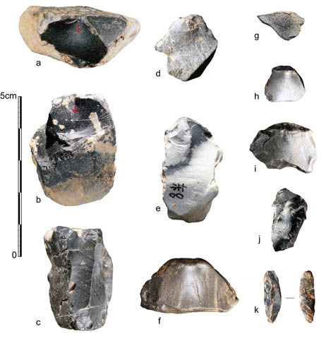 图4:龙骨洞遗址发掘出土的石核和石片(李浩供图)