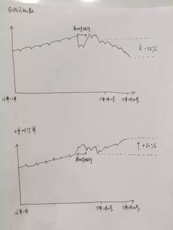 滴滴高级产品总监罗文近日在知乎发起有关“打车难”的对话,称从滴滴后台数据来看,今年司机回家早,运力下降。在其晒出有关“滴滴在线司机数据”和“北京订单需求”的两张手绘图表中,虽然隐去了具体数值,但可以明显看出,前一张图表近期呈现了直线下降,标注数据显示下降超过25%。而出行订单数量同期上涨了3成。