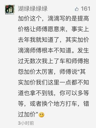 小刘:滴滴平台又没有强制派单,所以司机一听到不想去的地方,或者是等着就要加价。其实前端就是和拒载一样的,但是这本来是双向随机的选择,但是现在变成了你的目的地信息被掌握了,你又还没上车就不算拒载了。
