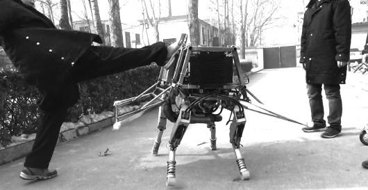 在正常行走的状态下,一个成年人用力对山大的这款四足机器人进行侧踹,它依然能够保持平衡。 (视频截图)谷歌旗下波士顿动力研发的机器狗BigDog自诞生以来,受到不少关注。在国内,山东大学也在研发一款类似BigDog的四足机器人。山东大学机器人研究中心是在原山东大学自动化研究所的基础上,通过引进留学归国人员、国内和校内机器人和数控研究人才,于2003年建立起来的从事机器人及相关技术的研究机构,也是我国机器人研究和应用的重要单位。山大机器人研究中心十年来一直专注于四足机器人的自主研制,虽与美国等发达国家相比还存在一定差距,但在国内已属于领先的位置。