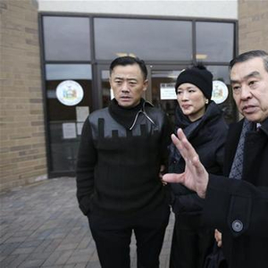 1月20日,在美国纽约州拿骚县地区法院,周立波(左一)获得保释后和律师莫虎(右一)在法院外接受采访。 新华社记者王迎摄