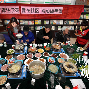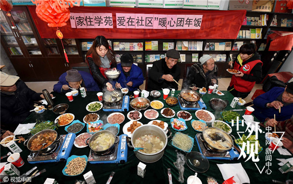 2017年1月21日,安徽省合肥市瑶海区七里站街道学苑社区,爱心志愿者在陪伴社区孤寡空巢老人共吃团圆“年夜饭”。(视觉中国)