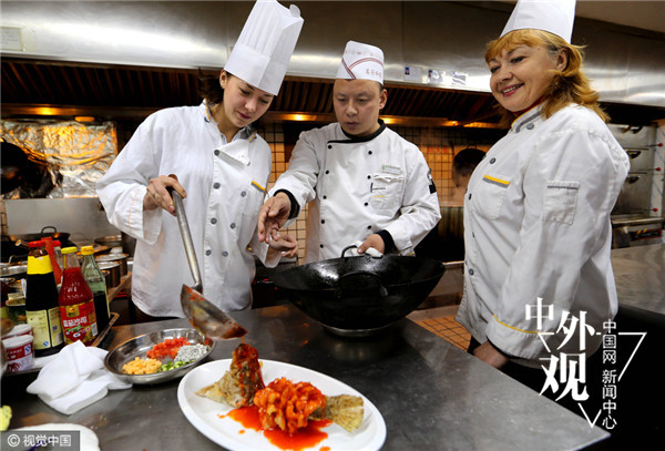 2017年1月22日,江苏连云港,外国友人在当地一家星级酒店展示自己烧好的中国菜。(视觉中国)