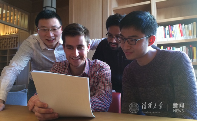 春节期间仍留在书院学习的王者(中国,左一)、常然(Anurag Chandran,印度,右二)、罗泰(Tyler Ross,美国,左二)、萧立勋(中国台湾,右一)在阅读刘延东副总理的回信。