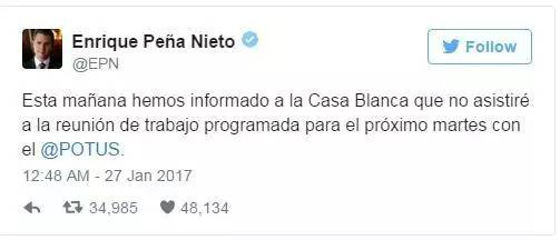 稍早,此前重申不会为边境墙买单的Nieto在Twitter上用西班牙语发帖称:“今天上午我们已经通知白宫,我不会出席下周二的会议。”