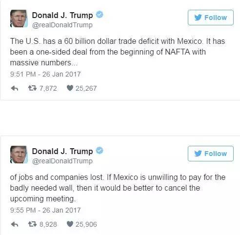 不过,墨西哥总统当时还没有取消于1月31日前往华盛顿与特朗普会面的计划。 他表示:“我会基于在华盛顿开会的墨西哥官员的最终报告,并同参议院及全国州长会议代表协商之后,决定下一步将采取怎样的措施。”