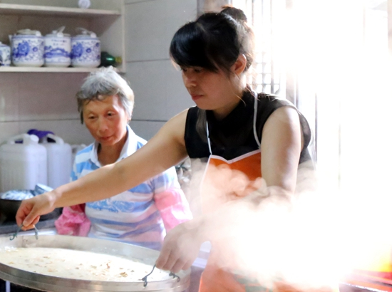 “耕为立命之本,读是修身之策”。耕读传家的瑶湾,俨如考水的一枚扣子。而考水、瑶湾、瑶村坦、章村与西冲都是历史上串起来的路径。在瑶湾汉龙兄的念恩堂,八仙桌上一碗绿茶,一碟米糕,一碟南瓜子,一碟花生,一碟黄豆,由内而外都散发着主人的热情与乡土的味道。那天是中秋前的一天,正好赶上磨“水粉”(米浆)蒸汽糕。出于好奇,我去厨房观看了蒸汽糕的全过程:装箅、配料、入锅蒸、出锅,然后,抹辣椒油,撒上葱花,斜刀切成菱形块状装盘,就可以端上餐桌了。印象深刻的是,柴火灶、大饭锅,入锅蒸汽糕过程中从锅盖逸出的蒸汽,香味扑鼻。按照婺源乡村人家的传统习俗,包清明粿@、蒸汽糕等节令食品第一箅出锅,得先送给亲朋邻里尝鲜,东家一碗,西家一碟,端去送来,讲究的是邻里亲朋之间的情谊与氛围。就是这样一锅软绵逸香入口即化的汽糕,不仅蒸出了“喜气”,还有“五谷丰登,蒸蒸日上”的祝福与精神的慰藉。不仅如此,在中秋月圆时,村里人还将舞起“禾杆龙”(稻草龙)以祈丰年。