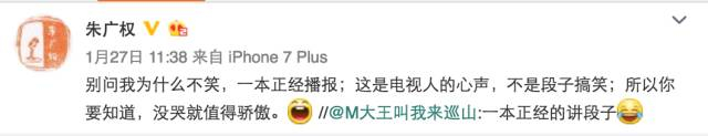 对此,朱广权在微博回复说:“别问我为什么不笑,一本正经播报;这是电视人的心声,不是段子搞笑;所以你要知道,没哭就值得骄傲。”