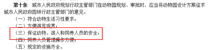 此外,《城市动物园管理规定》亦明确规定,动物园应保证动物、游人、饲养人员的安全。