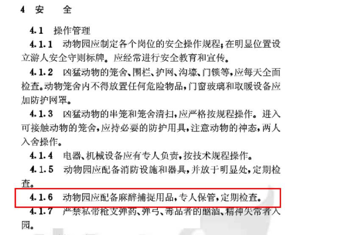 而《动物园动物管理技术规程》也明确规定,动物园应配备麻醉捕捉用品,专人保管,定期检查。