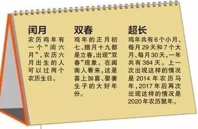 一些细心的网友发现,今年是农历丁酉鸡年,鸡年有两个立春日,出现“一年两头春”历法现象。所谓“一年两头春”也称“双春年”,是指在农历的一年中有两个立春之日。具体到农历鸡年来说,2017年1月28日开始进入农历鸡年,而直到2018年的2月16日才会迎来下一个农历新年,所以农历丁酉鸡年就包含了两个立春日,即鸡年的正月初七立春(2017年2月3日)和同年腊月十九(2018年2月4日)再次立春。