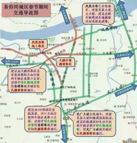 凤凰东路已全线通车,这条道路连接芙蓉大道、湘潭五大桥,如从易俗河方向准备去湘潭市区方向的车辆在二大桥发生拥堵时,建议沿凤凰东路、湘潭五大桥往湘潭方向行驶。