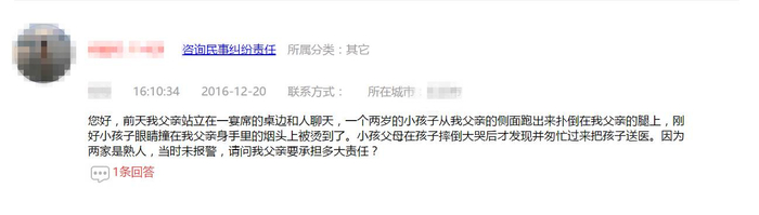 您好,我父亲站在宴席的桌边和人聊天,一个两岁的小孩子从我父亲的侧面跑出来扑倒在我父亲的腿上,刚好小孩子眼睛撞在我父亲身手里的烟头上被烫到了。小孩父母在孩子摔倒大哭后才发现并匆忙过来把孩子送医。因为两家是熟人,当时并未报警,请问我父亲要承担多大责任?