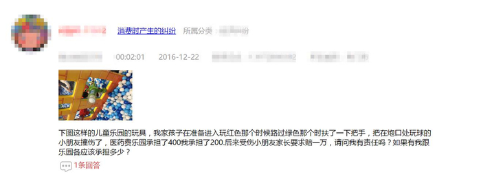 下图这样的儿童乐园,我家孩子路过绿色玩具时候扶了一下把手,把在炮口处玩球的小朋友撞伤了,医药费乐园承担了400元,我承担了200元.后来受伤小朋友家长要求赔一万,请问我有责任吗?如果有我跟乐园各应该承担多少?