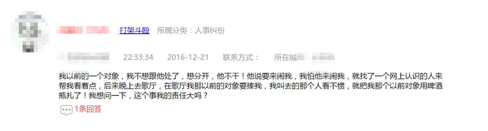 我以前的一个对象,我不想跟他处了,想分开,他不干!他说要来闹我,我怕他来闹我,就找了一个网上认识的人来帮我看着点,后来晚上去歌厅,在歌厅我那以前的对象要揍我,我叫去的那个人看不惯,就把我那个以前对象用啤酒瓶扎了!我想问一下,这件事我的责任大吗?
