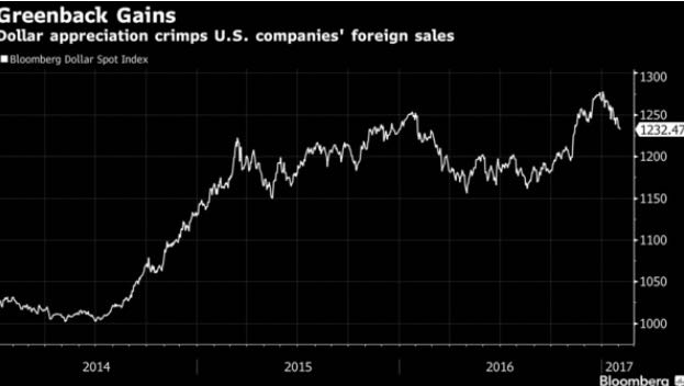 特朗普上台后的强势美元之下,美国企业越来越担心它们的利润会被侵噬。